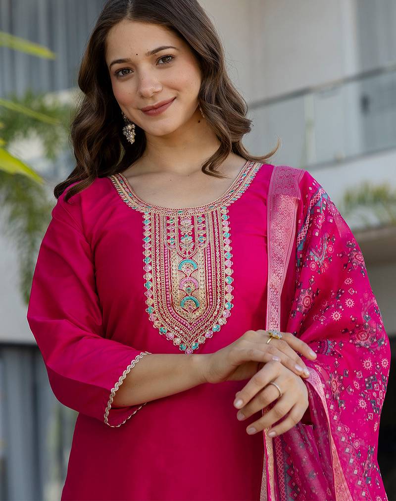 Product Name Rani Pink Chanderi Cotton Heavy Thread Embroidery Work With Printed Dupatta Kurta Pant Set