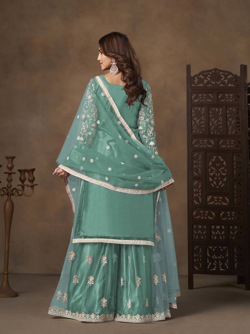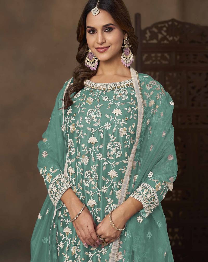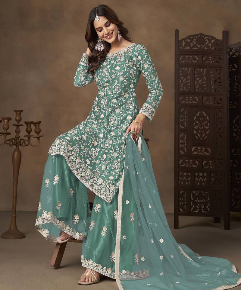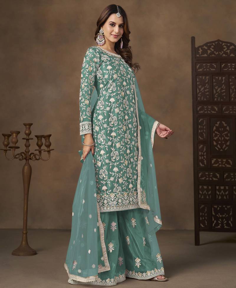 | Product Name | Turquoise Net Heavy Thread Embroidery With Sequins Work Palazzo Suit | |