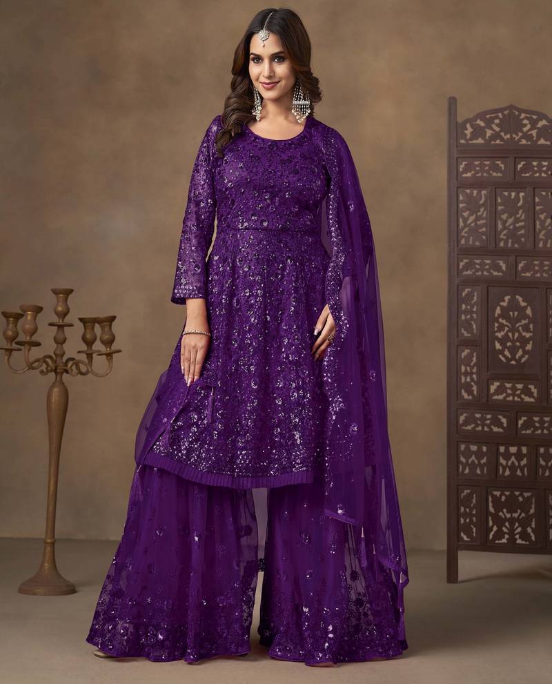 | Product Description | Top Fabric: Net, Top Color: Violet, Bottom Fabric: Net, Bottom Color: Violet, Dupatta Fabric: Net, Dupatta Color: Violet, Inner Fabric: Santoon, Work: Heavy Thread Embroidery With Sequins Work, Remark: Sharara Suit (Sharara Fully Free Size Stitched) |