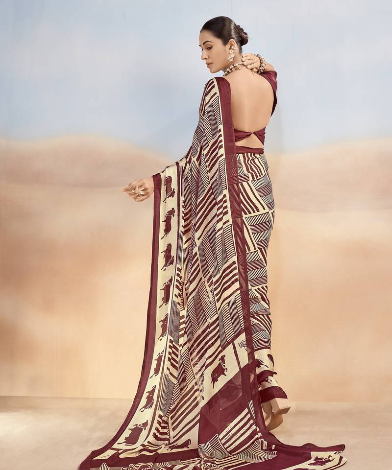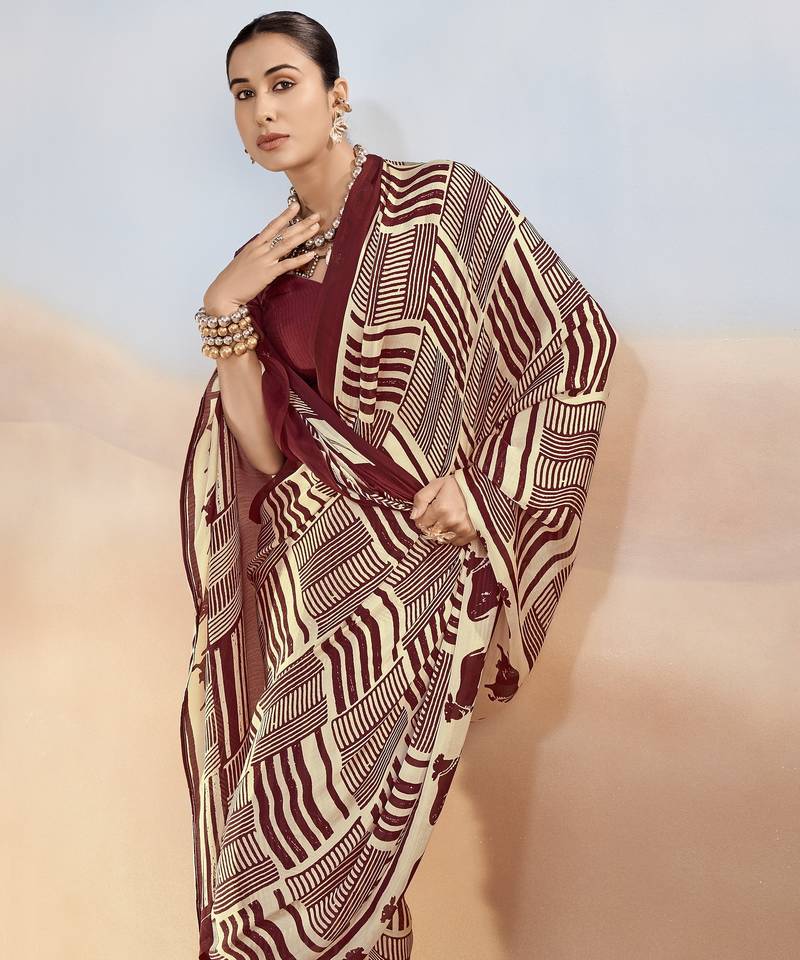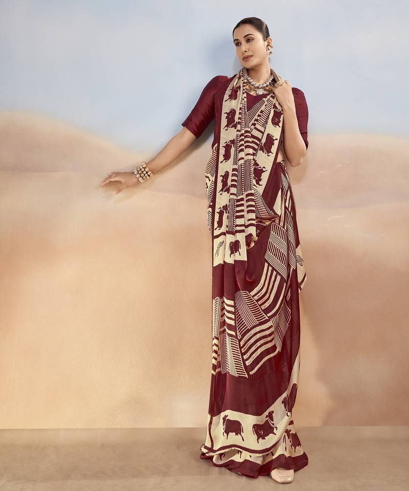 Maroon yellow contemporary printed satin silk saree with blouse piece