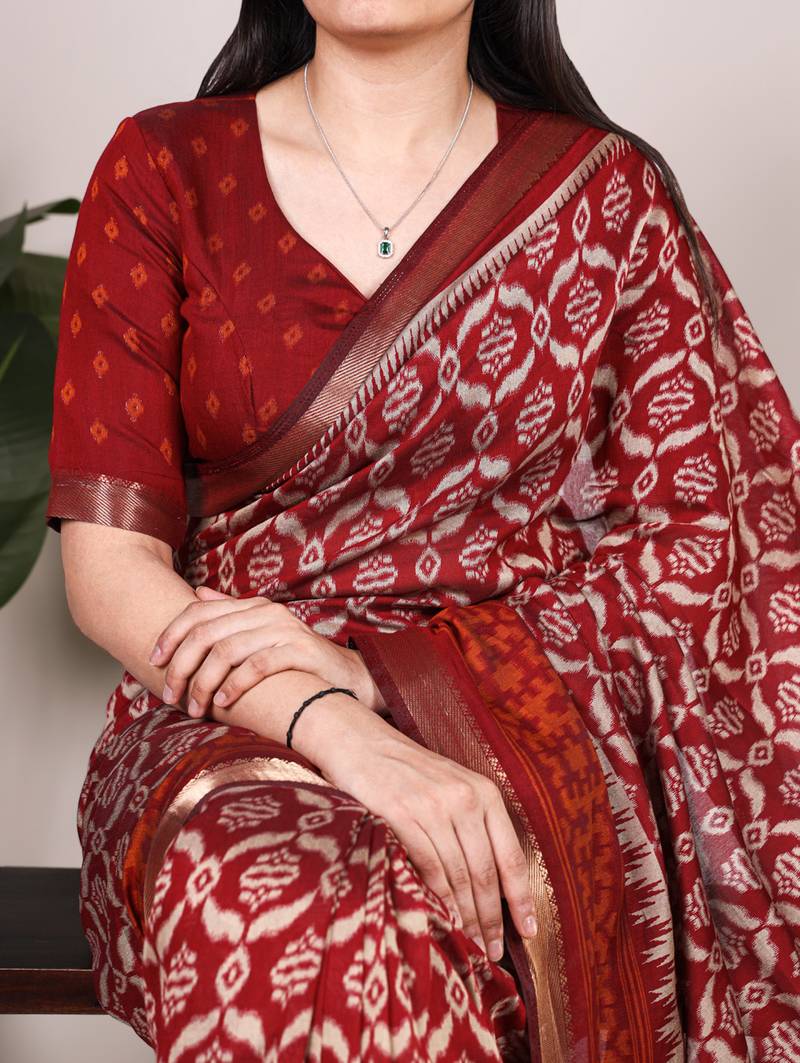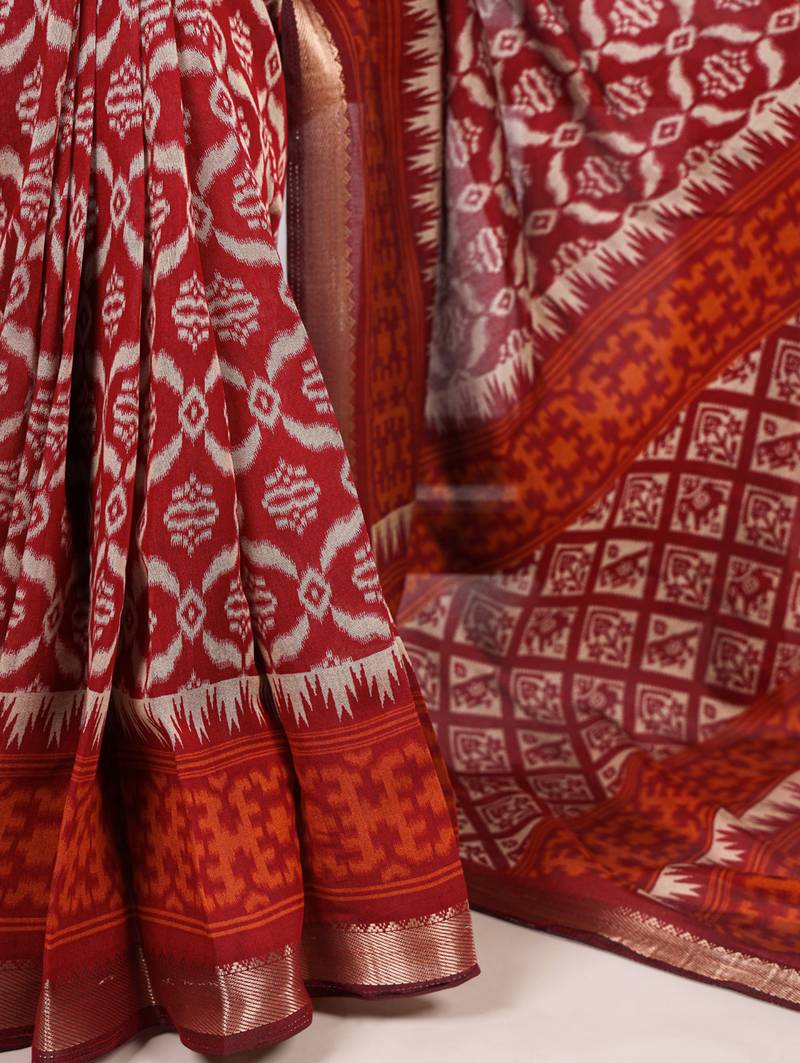 Polyester viscose chanderi ikat print saree with rich zari weaving border