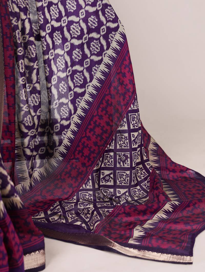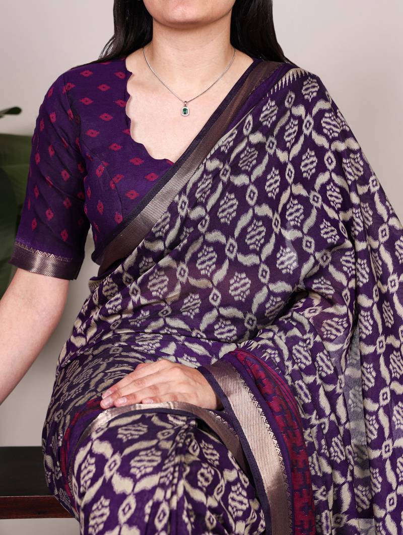 Polyester viscose chanderi ikat print saree with rich zari weaving border