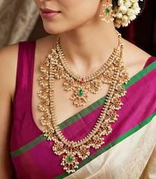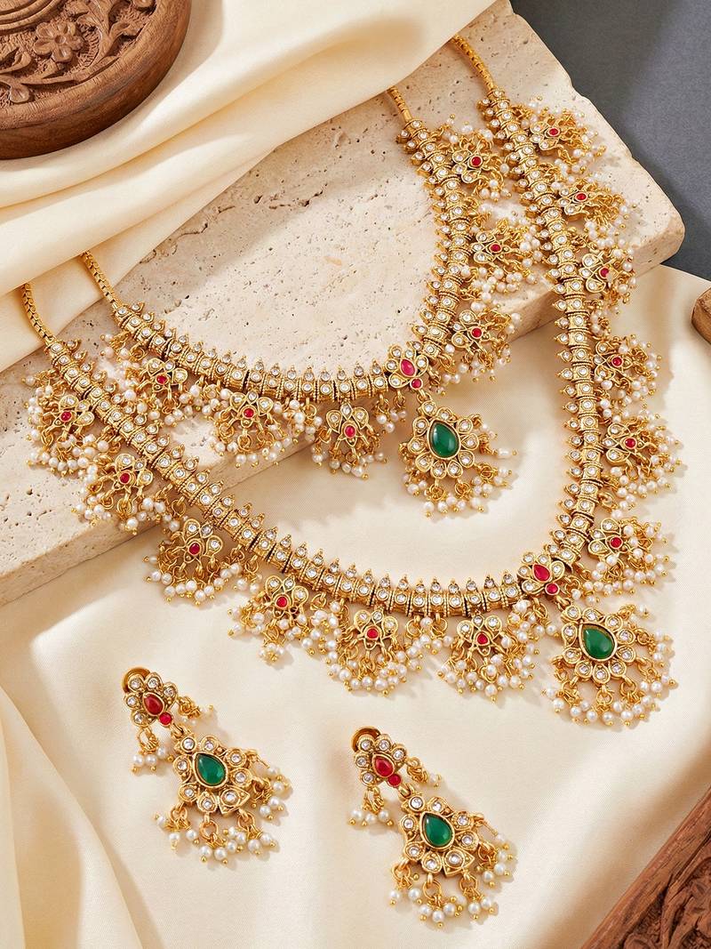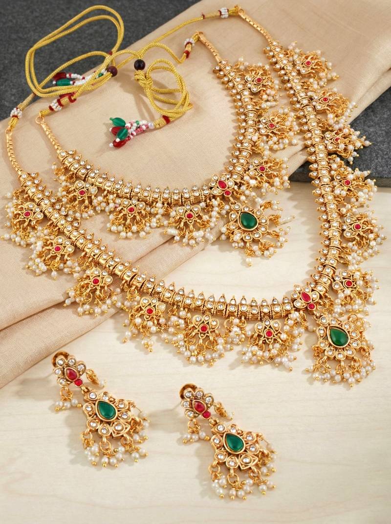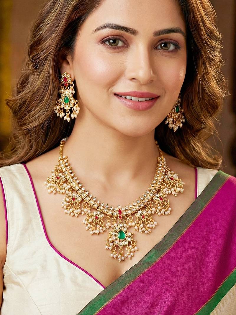 | Product Description | This Set Includes A Regal Long Necklace And A Coordinating Short Necklace, Both Featuring Intricate Gold Plated Motifs. Each Piece Is Meticulously Studded With Shimmering White Stones, Vibrant Ruby Red Accents, And A Prominent Teardrop Emerald Green Centerpiece. Paired With Matching Chandelier Style Drop Earrings, This Complete Bridal Combo Offers A Grand, Layered Look That Is Both Timeless And Elegant. |