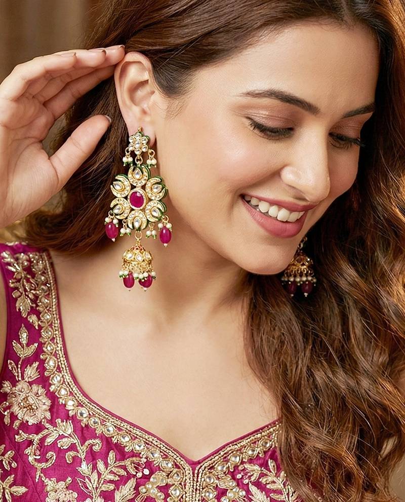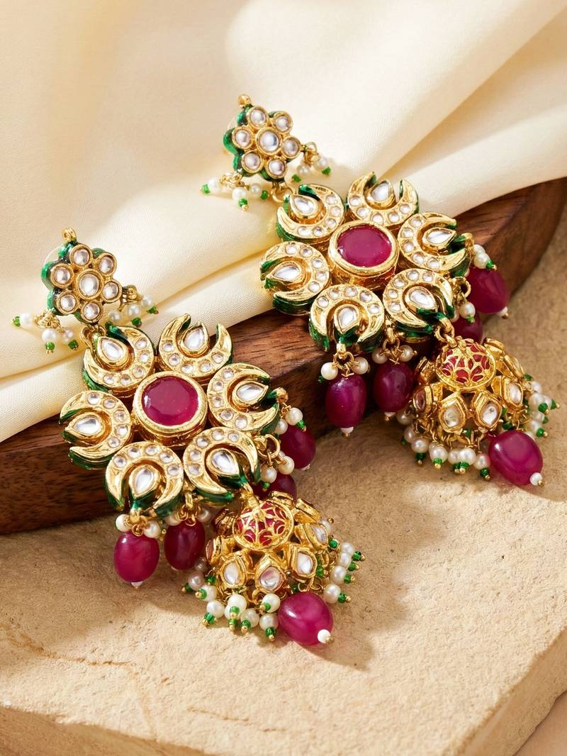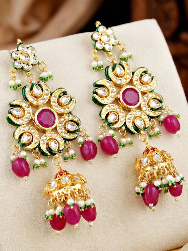 | Product Description | Lucky Jewellery 18 K Gold Plated Kundan Jhumkas With Red Stone & Back Meenakari |