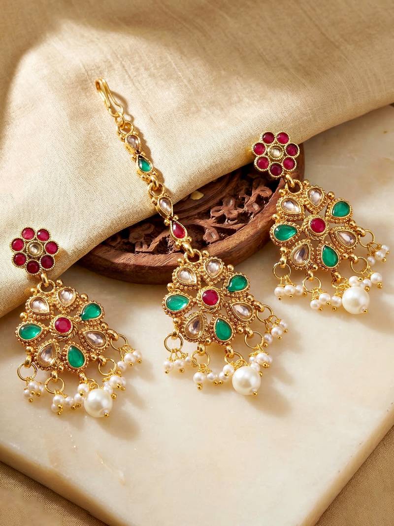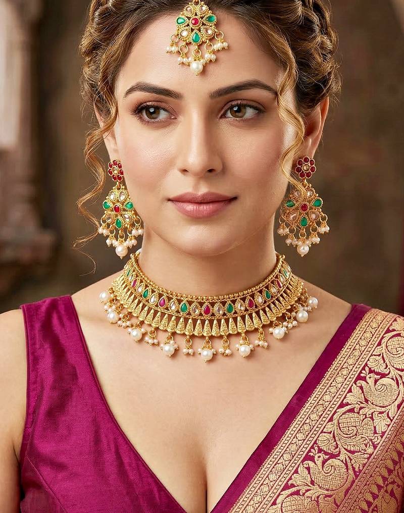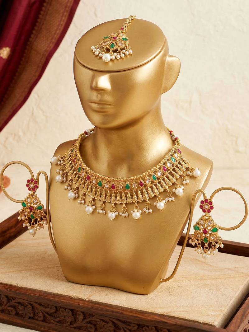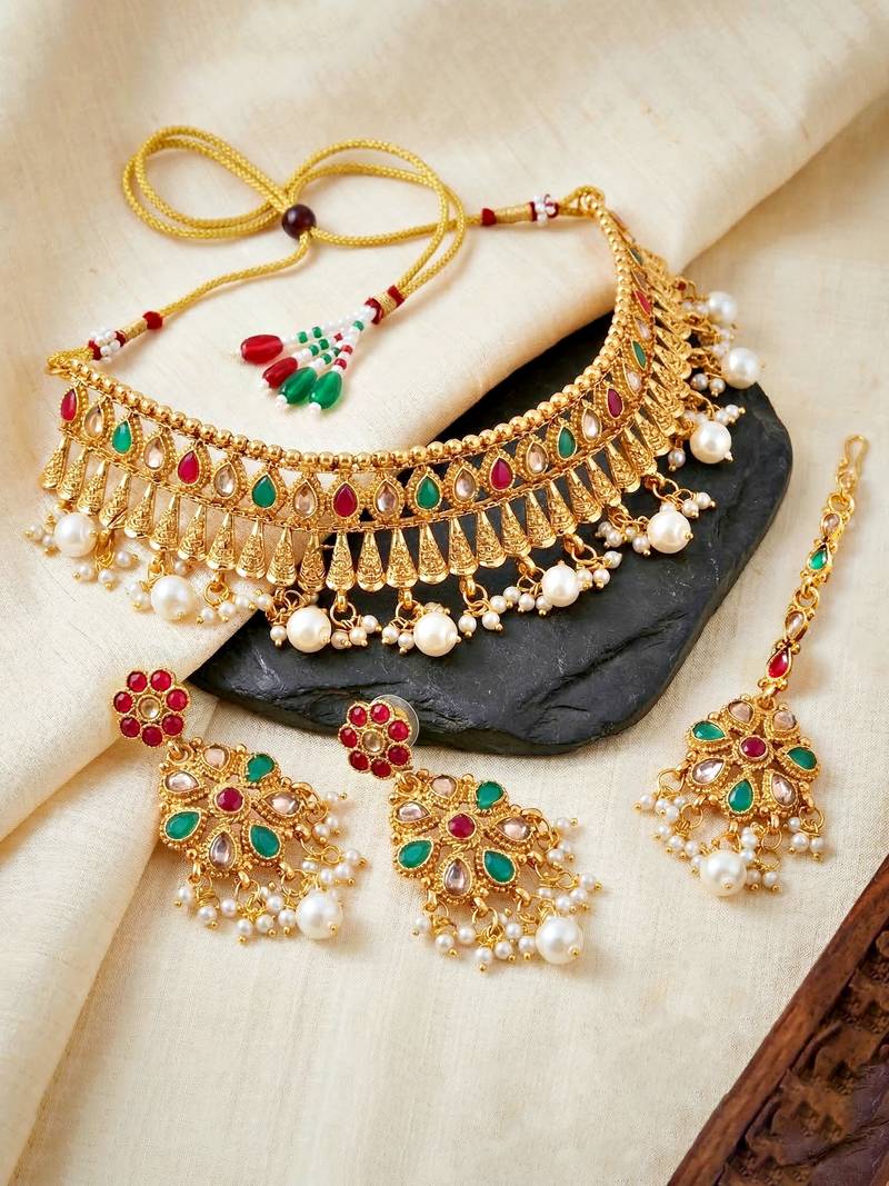 | Product Description | Elegant Gold Plated Choker Necklace Set Featuring Ruby And Green Color Accents With Pearl Drops, Including Matching Earrings And Maang Tikka. Perfect For Weddings, Festive Occasions And Ethnic Wear. |