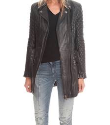 Women’s black quilted lambskin leather biker jacket longline moto coat