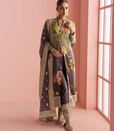 Beige & purple emboidery sequince & printed silk front cut a-line kurta pant suit- - full stitched free size