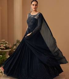 Deep navy chinnon silk cape anarkali with golden zari thread floral embroidery and sequin detailing 42") stitched