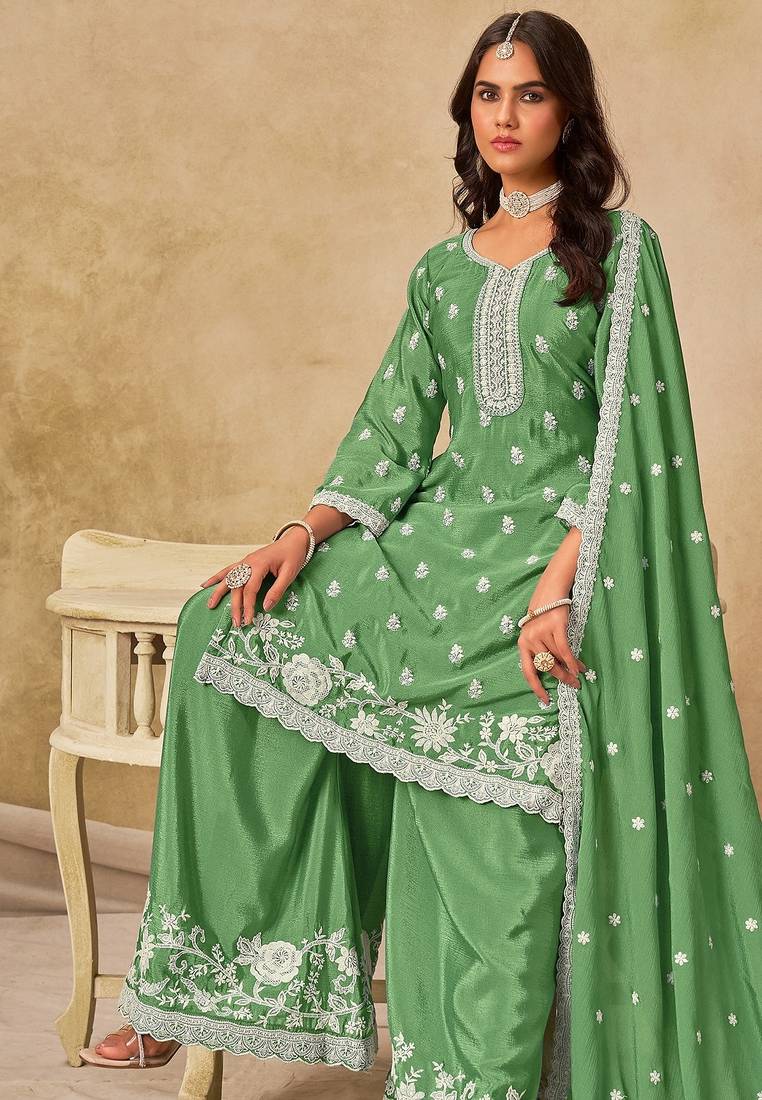 Green chiffon hand embroidery semi stitched salwar suits suits size up to 42