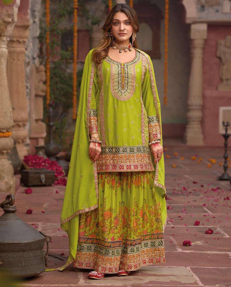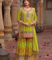 Green embroidery and digital print chinnon silk straight kurti sharara suit- full stitched free size