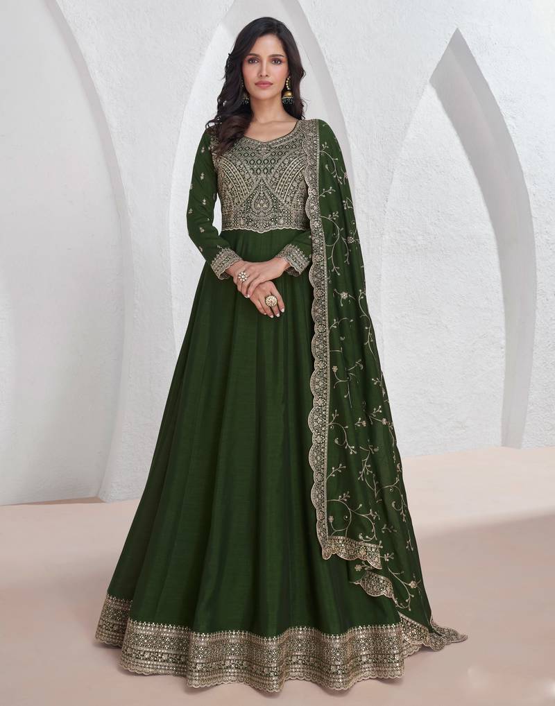 Green embroidery & sequins silk dupatta gown- full stitched free size
