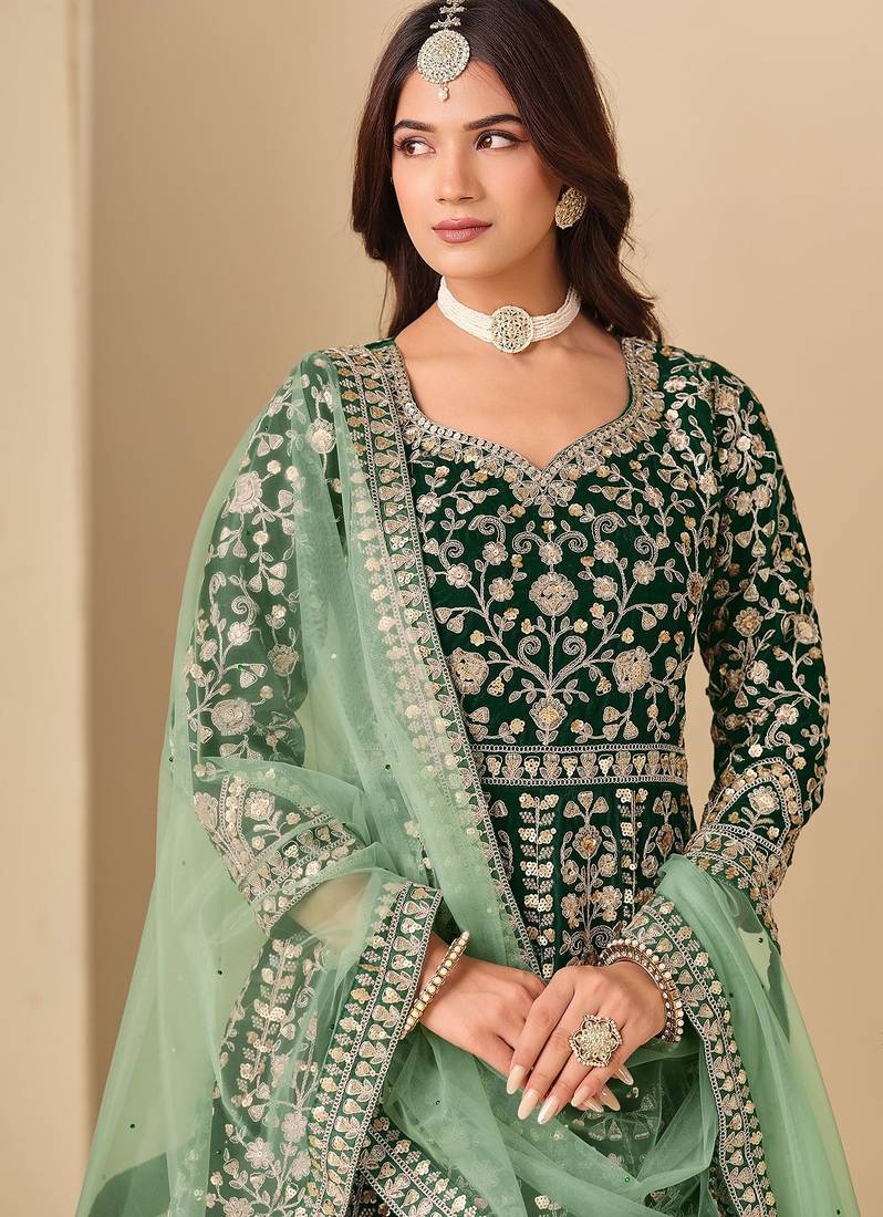 Green velvet sequins work semi stitched salwar suits suits size up to 42