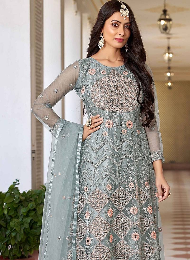 Grey net sequins work semi stitched salwar suits suits size up to 42