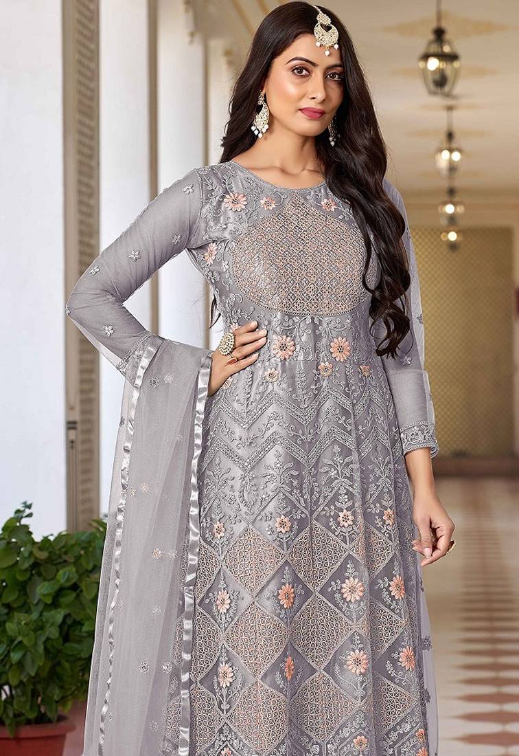 | Product Name | Grey Net Sequins Work Semi Stitched Salwar Suits Suits Size Up To 42 | |