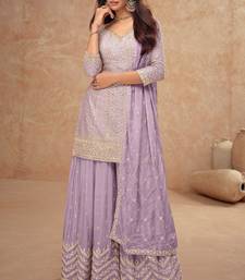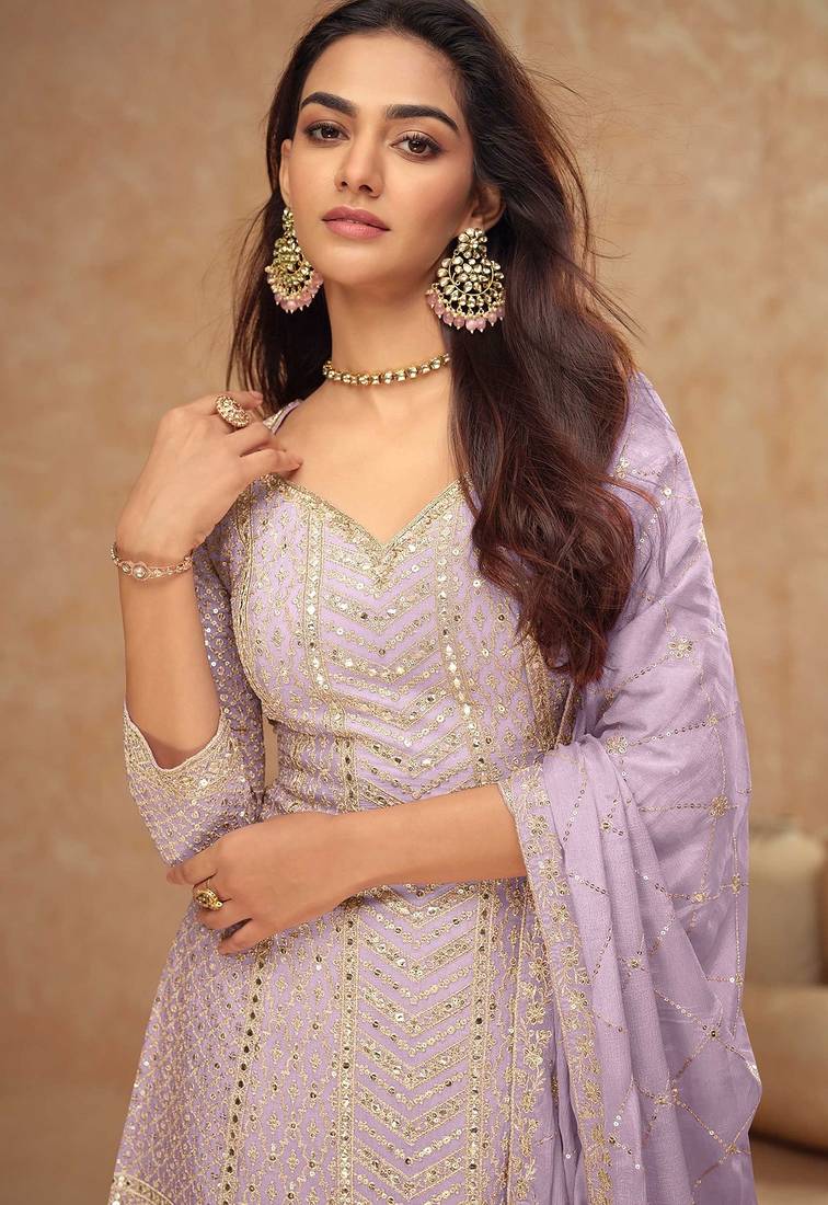 Lilac chiffon sequins work semi stitched salwar suits suits size up to 42