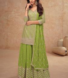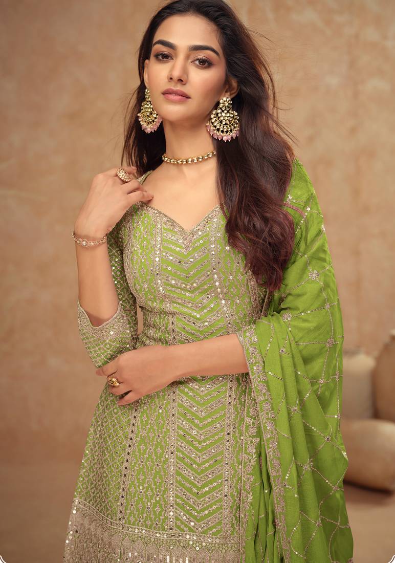 Product Name | Lime Green Embroidery & Sequins Work Chinnon Silk Straight Palazzo Free Size Stitching (Size Upto 42") | |