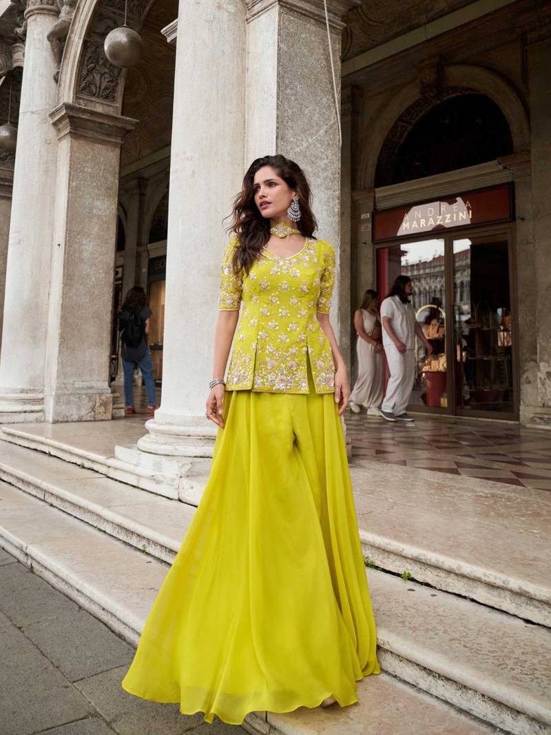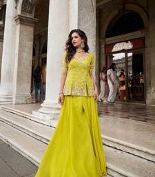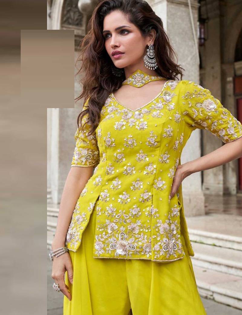Lime yellow organza peplum palazzo suit with zari, sequins, bead and thread work, free-size stitched.