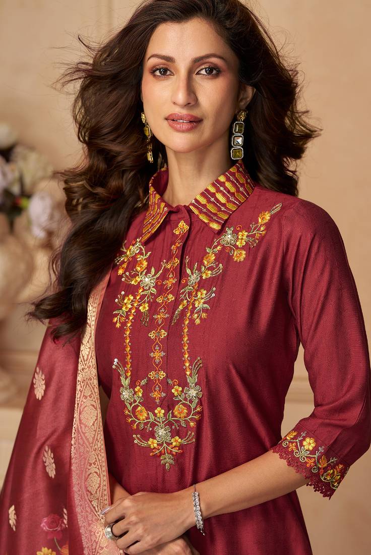 | Product Name | Maroon Hand Work Embroidery Sequins Viscose Patiala Straight Suit Full Stitched Free Size | |