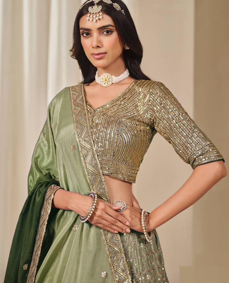 Mehendi Chiffon Sequins Work Semi Stitched Lehenga Choli Size Up To 42