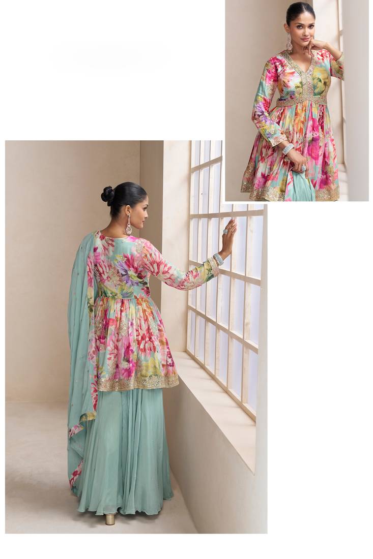 | Product Name | Multi Zari Embroidered & Printed Chinnon Short Straight Top Palazzo Suit Full Stitched Free Size | |