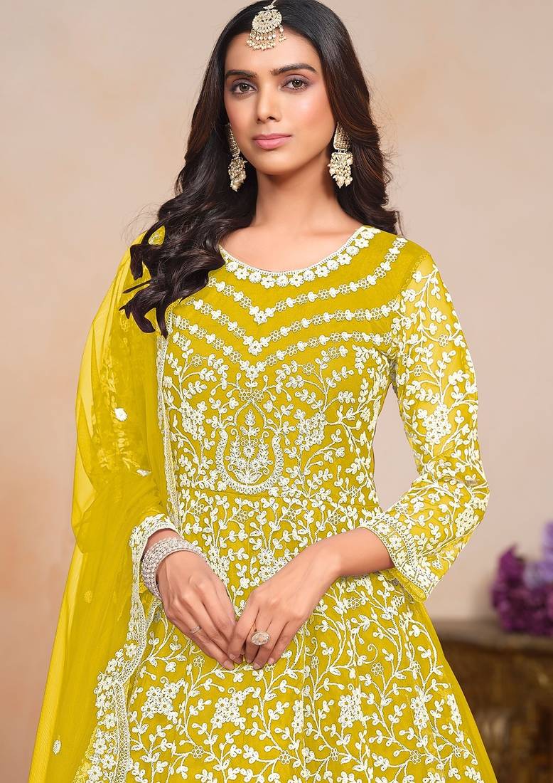 | Product Name | Mustard Net Embroidery & Sequins Semi Stitched Suit Size Up To 42 | |