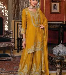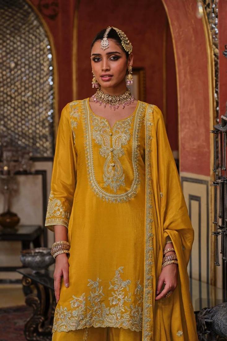 Mustard yellow embroided chinnon straight top palazzo suit- full stitched free size