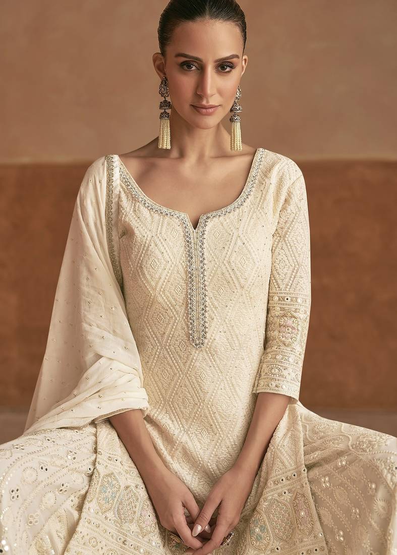Off white georgette sequins work semi stitched salwar suits suits size up to 42