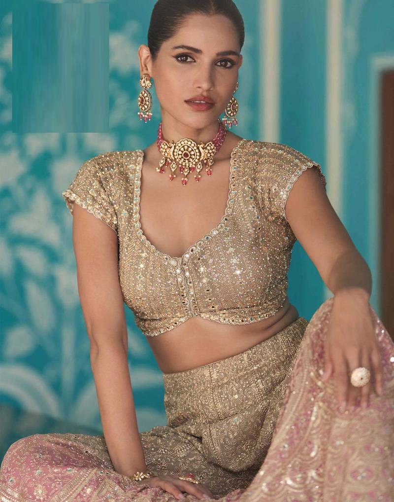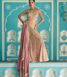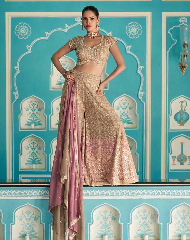 Pink georgette blouse palazzo suit with sequin, zari weaving & shimmer embroidery, free-size stitched.