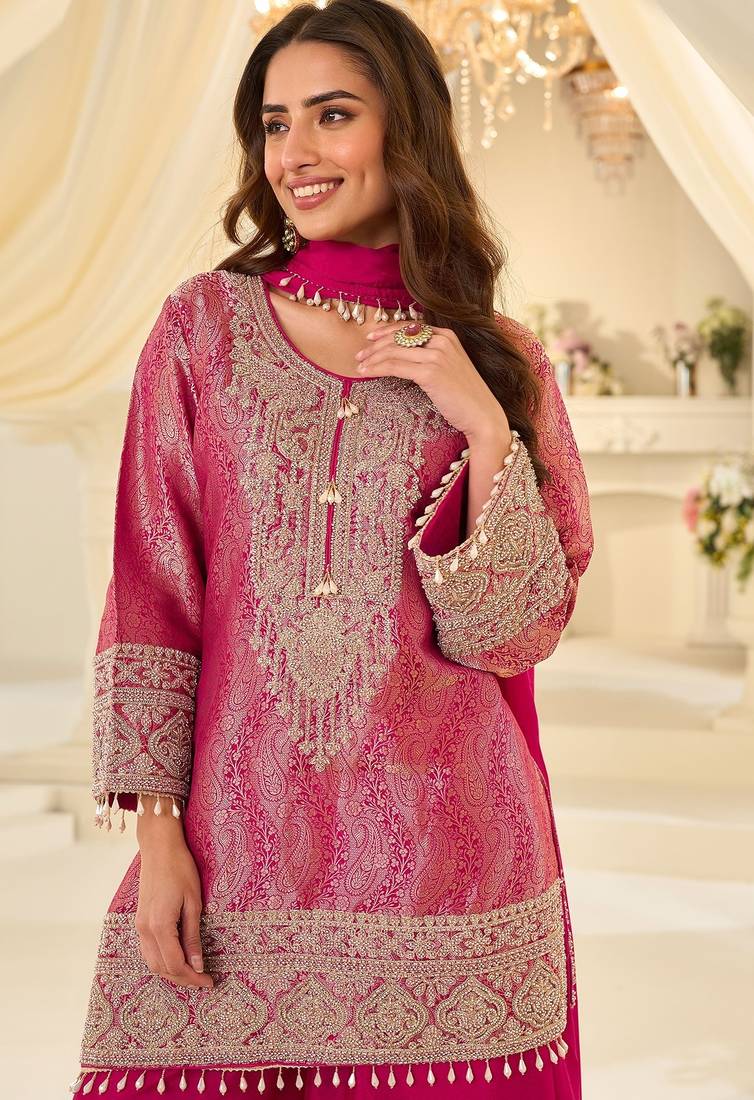 Pink silk blend sequins work salwar suits free size up to 42 stitched