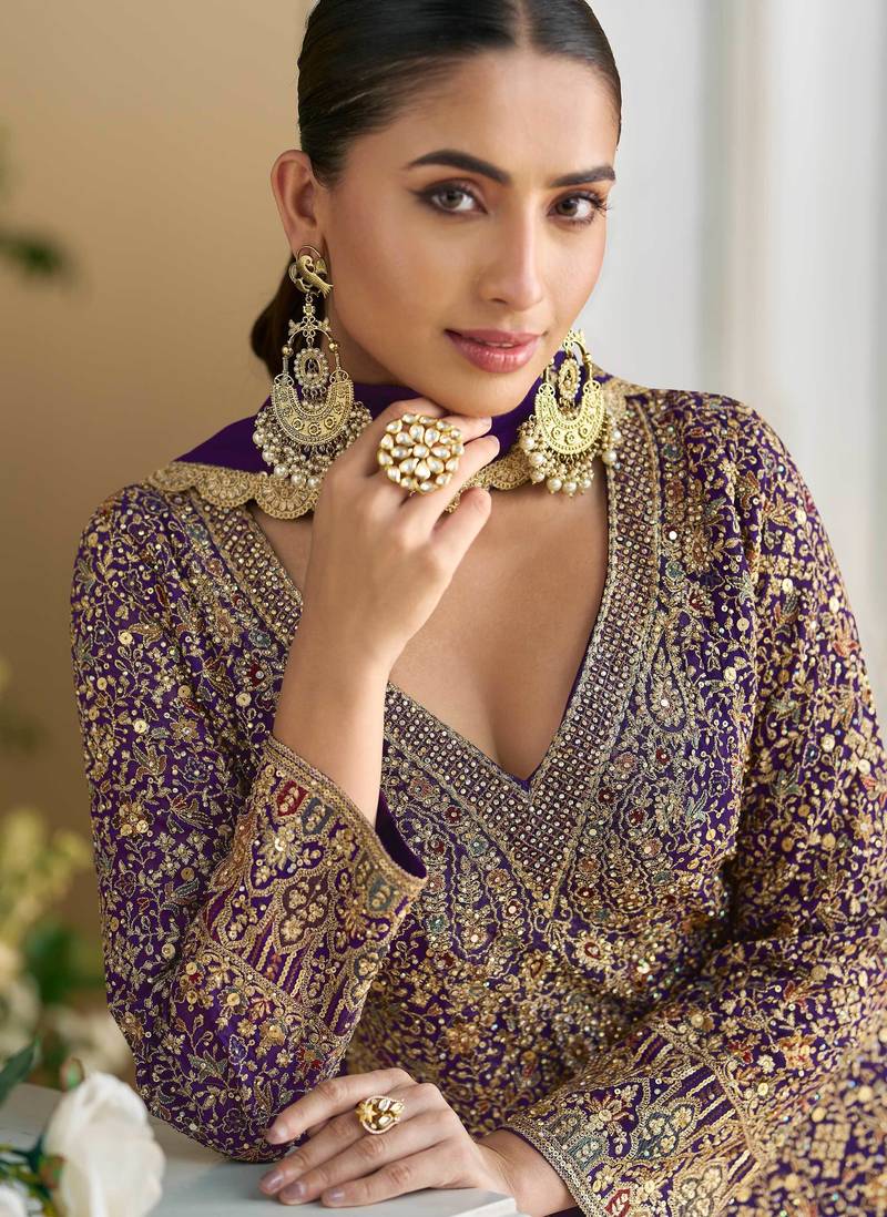 | Product Name | Purple Thread Embroidery Sequins & Stone Georgette Palazzo Anarkali Suit Full Stitched Free Size | |