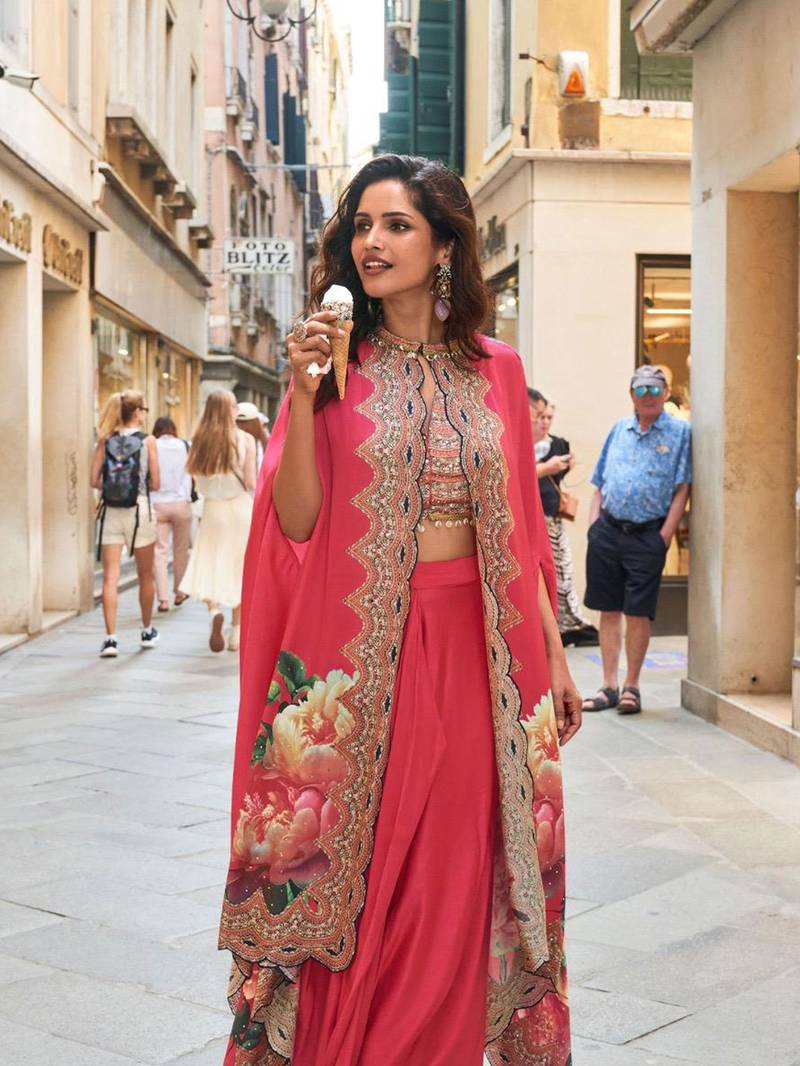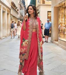 Red embroidery and digital hand work only french crep blouse dhoti-full stitched free size