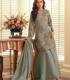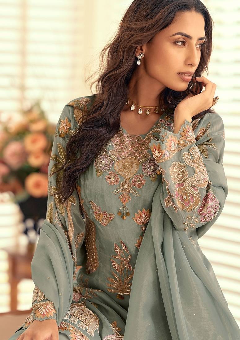 Sea green silk blend sequins work semi stitched salwar suits suits size up to 42