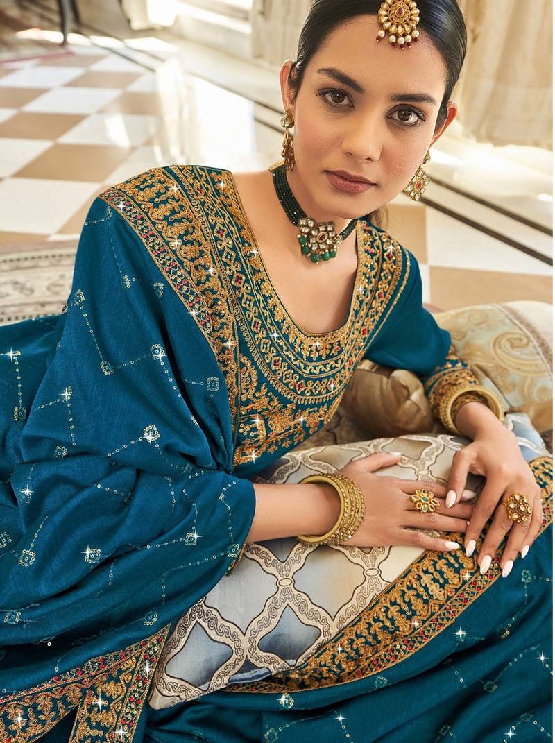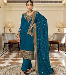 Teal blue art silk stone work semi stitched salwar suits suits size up to 42