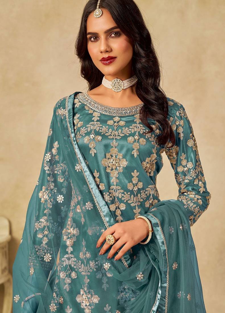 | Product Name | Teal Blue Net Sequins Work Semi Stitched Salwar Suits Suits Size Up To 42 | |