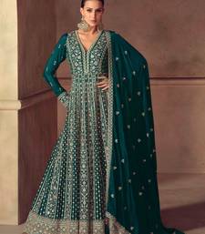 Teal blue zari embroidery sequins & beads chinnon dupatta gown- full stitched free size