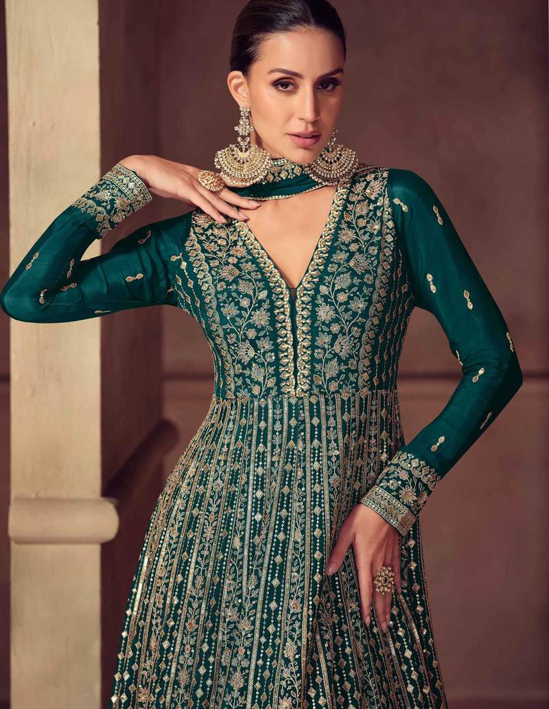 | Product Name | Teal Blue Zari Embroidery Sequins & Beads Chinnon Dupatta Gown Full Stitched Free Size | |