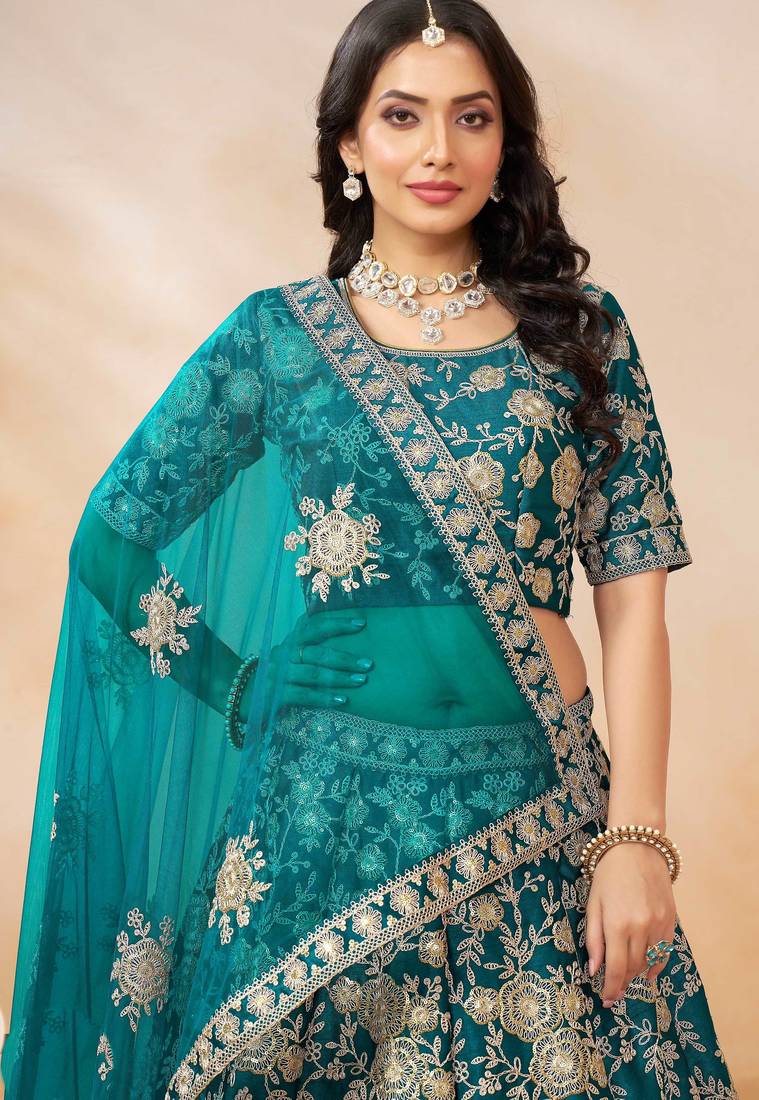 Teal green art silk sequins work semi stitched lehenga choli size up to 42
