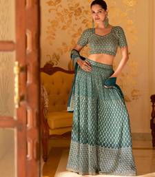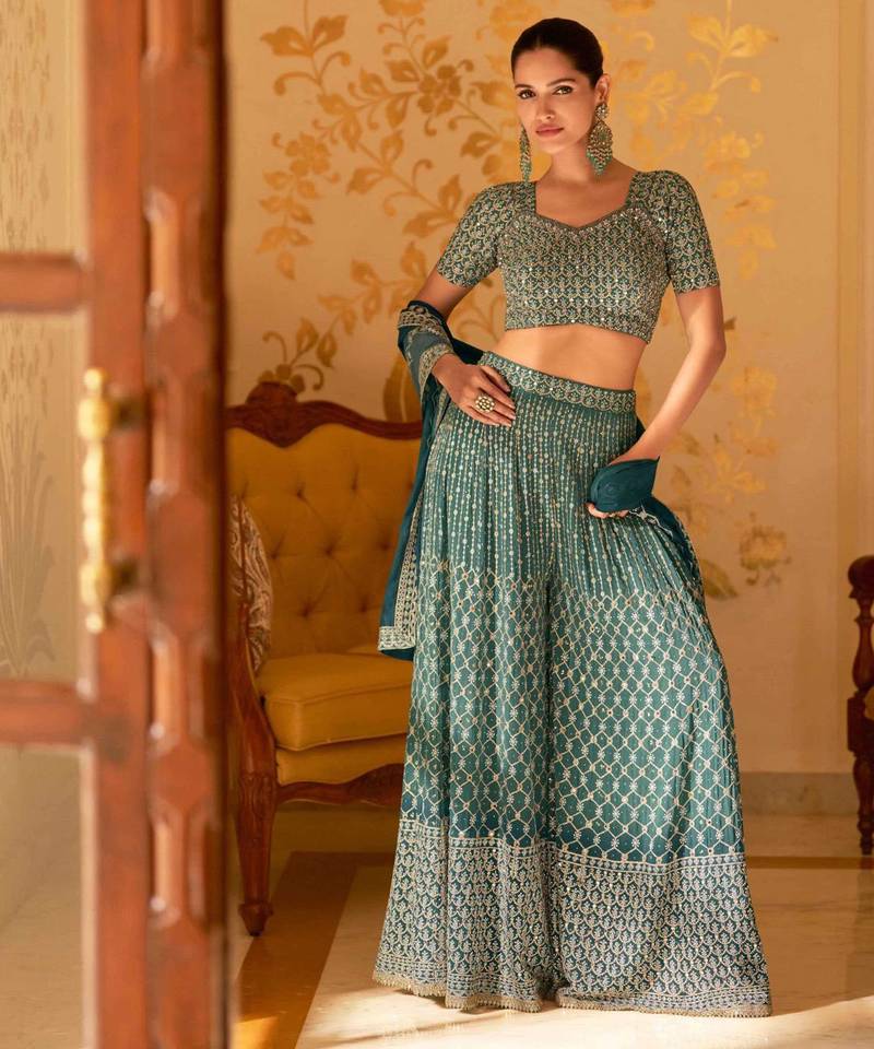 Teal green georgette blouse palazzo suit with sequin, zari weaving & shimmer embroidery, free-size stitched.