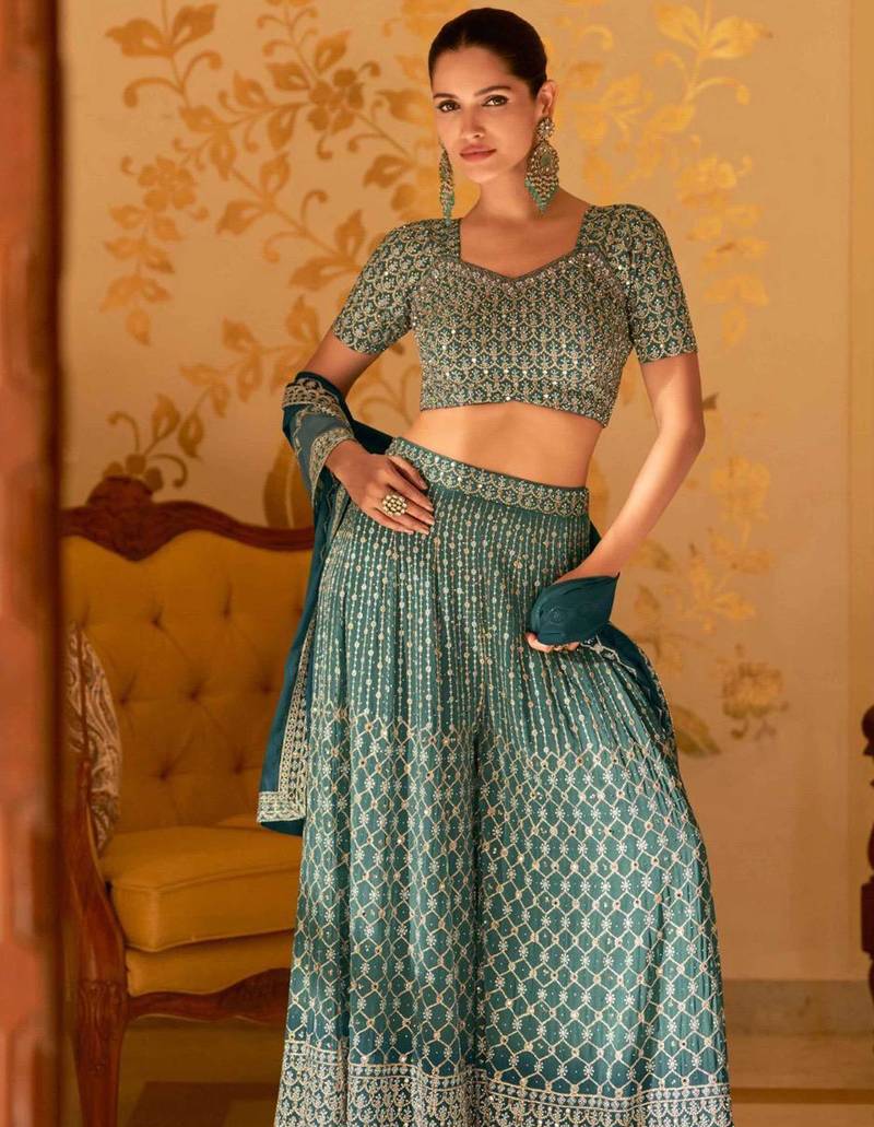 | Product Name | Teal Green Georgette Blouse Palazzo Suit With Sequin, Zari Weaving & Shimmer Embroidery, Free Size Stitched. | |