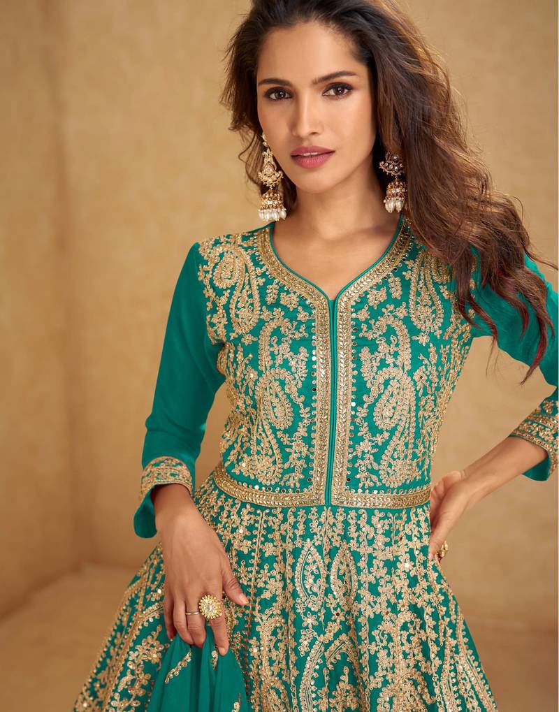 Turquoise blue zari embroidery mirror & sequins chinnon silk lehenga anarkali suit- full stitched free size