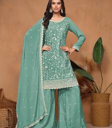 Turquoise chinnon embroidery & sequins semi stitched suit size up to 42