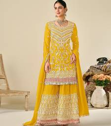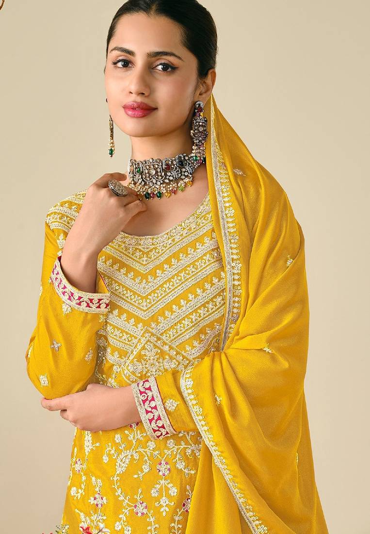 Yellow chiffon sequins work semi stitched salwar suits suits size up to 42
