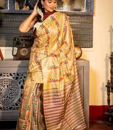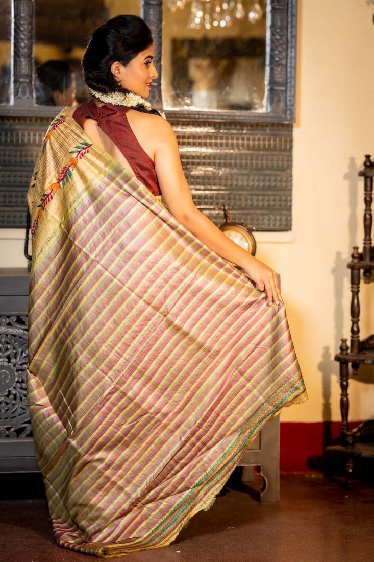 | Product Description | The Golden Beige Pure Bishnupuri Katan Handloom Kantha Stitch Embroidery Saree Features All Over Multicolour Floral Motif Stripes, Delicately Brought To Life Through Intricate Kantha Stitch Embroidery.