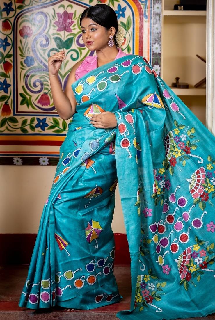 | Product Description | The Dark Aqua Blue Pure Gachhi Tussar Silk Handloom Kantha Stitch Embroidery Saree Features All Over Multicolour ‘Umbrella’ & ‘Sunglass’ Motif Buta, Beautifully Embroidered Across The Saree, Including The Border & Pallu, With Delicate Kantha Stitch Detailing.