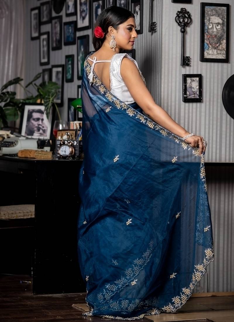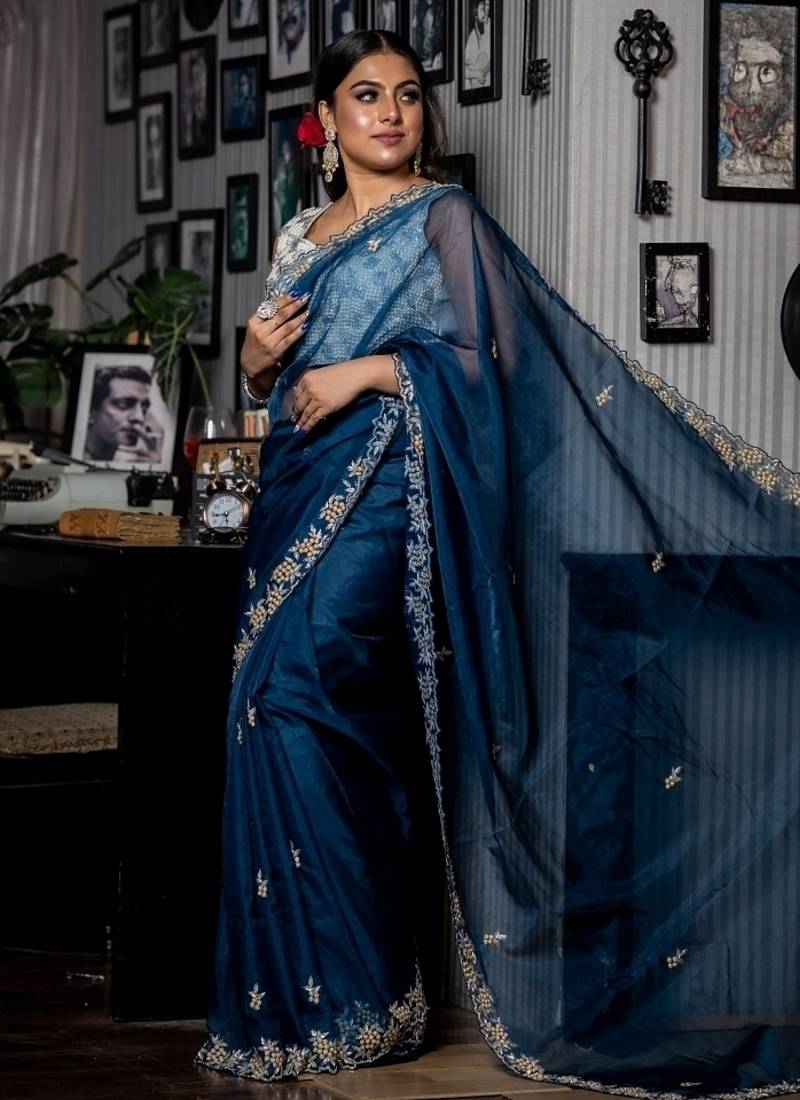 | Product Description | The Navy Blue Soft Organza Saree Features All Over Moti, Silver &Gold Cut Dana Handwork Floral Motif Buta & Border — Adding Depth, Detail, & Richness To Its Airy Base.