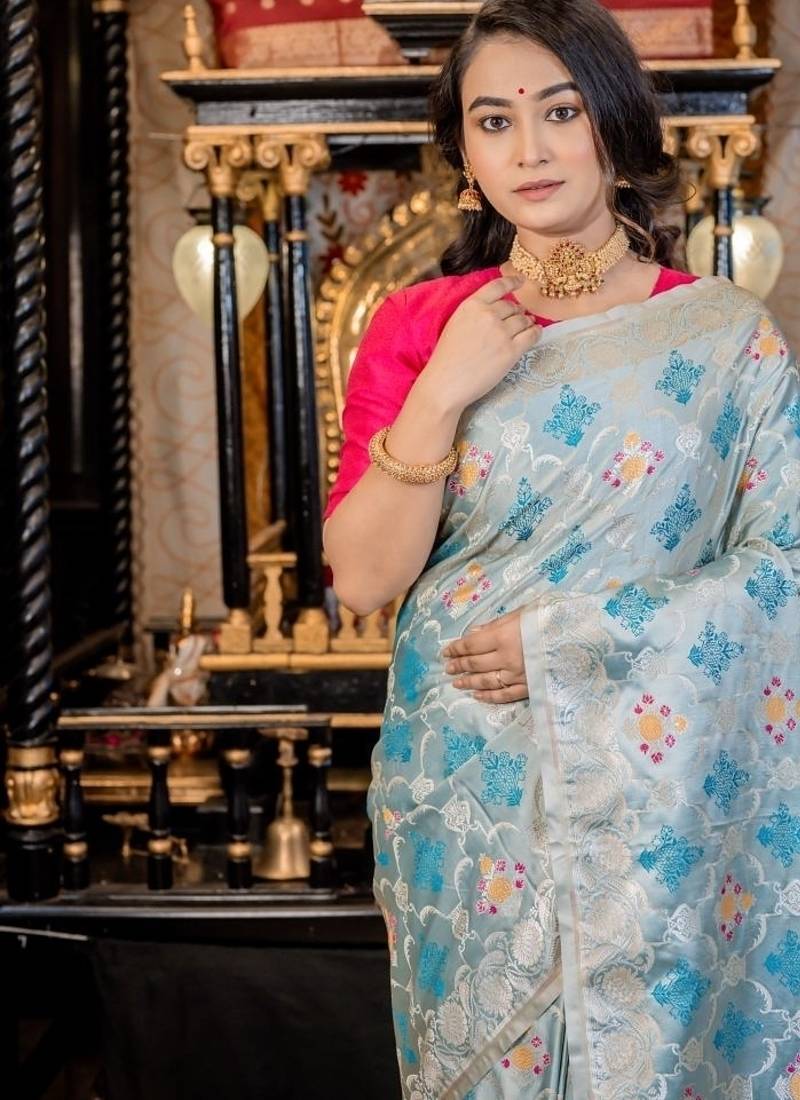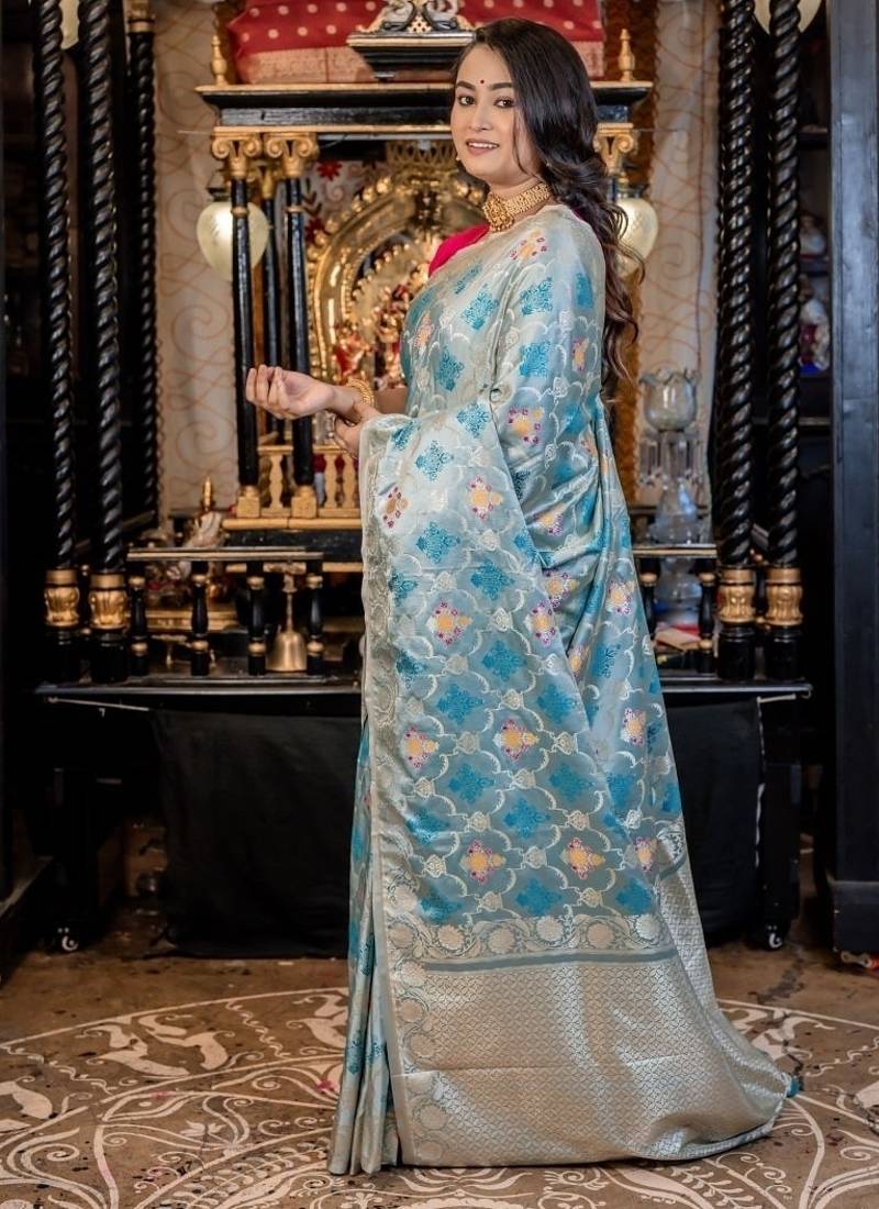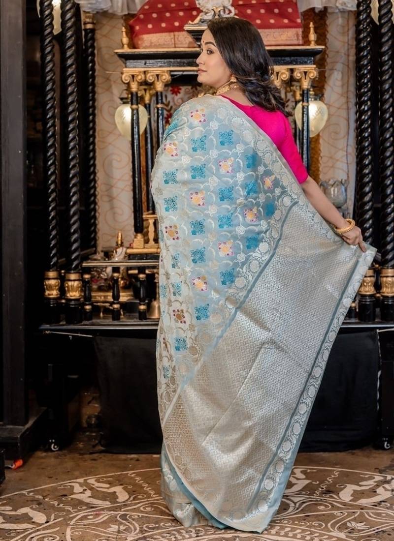 | Product Description | Woven With All Over Silver Zari Jaal & Buta, It Is Further Elevated By Intricate Multi Colour Meenakari Accents That Add Subtle Pops Of Vibrance. The Ice Blue Mashru Silk Banarasi Saree Brings A Serene Elegance To The Weave, Making It Both Eye Catching & Effortlessly Graceful.