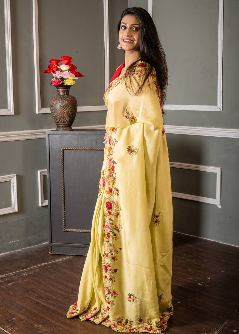 Green embroidered faux silk blend blend hand embroidery all seasons sarees