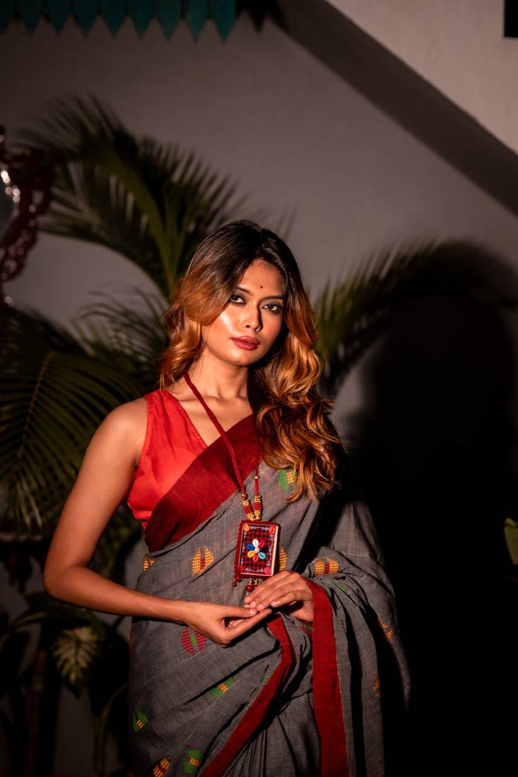 | Product Description | The Dark Grey Cotton Bengal Handloom Saree Features All Over Multi Colour 'kantha' Buta, Finished With A Coordinated Stripe Pallu — A Beautiful Canvas Of Texture, Colour, & Traditional Embroidery Inspired Design.
