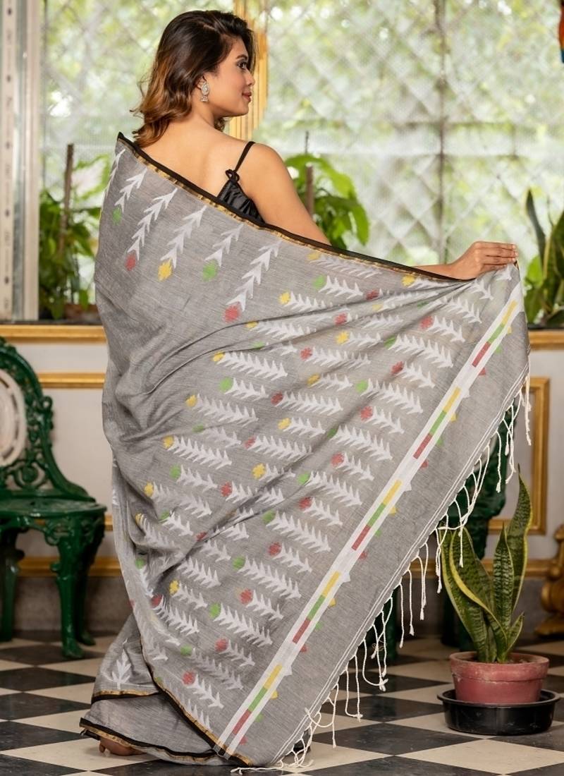 | Product Description | The Steel Grey Cotton Bengal Handloom Saree Features A Plain Body, Framed By A Sleek Black & Antique Gold Zari Border With Multi Colour Floral Jamdani Motifs Extending Into The Pallu — A Refined Blend Of Subtle Tones & Vibrant Craftsmanship.
