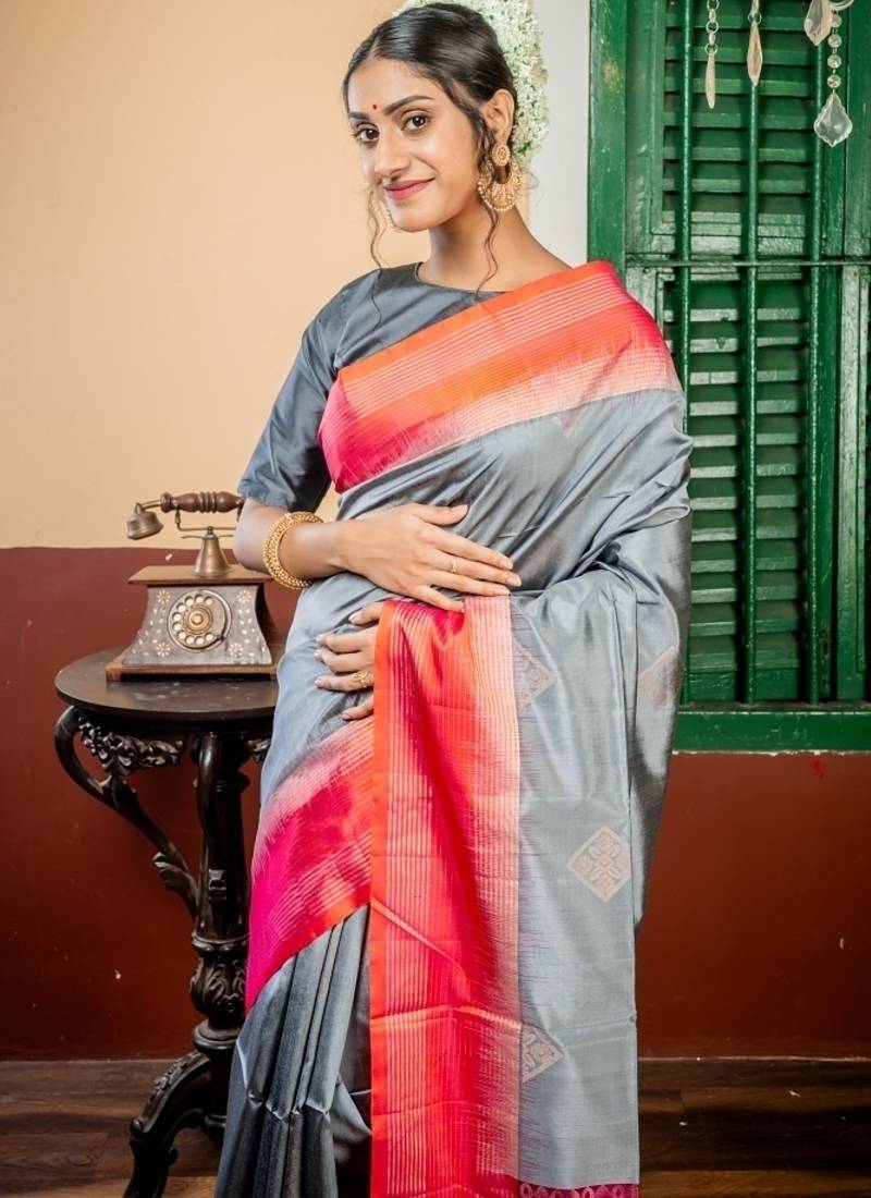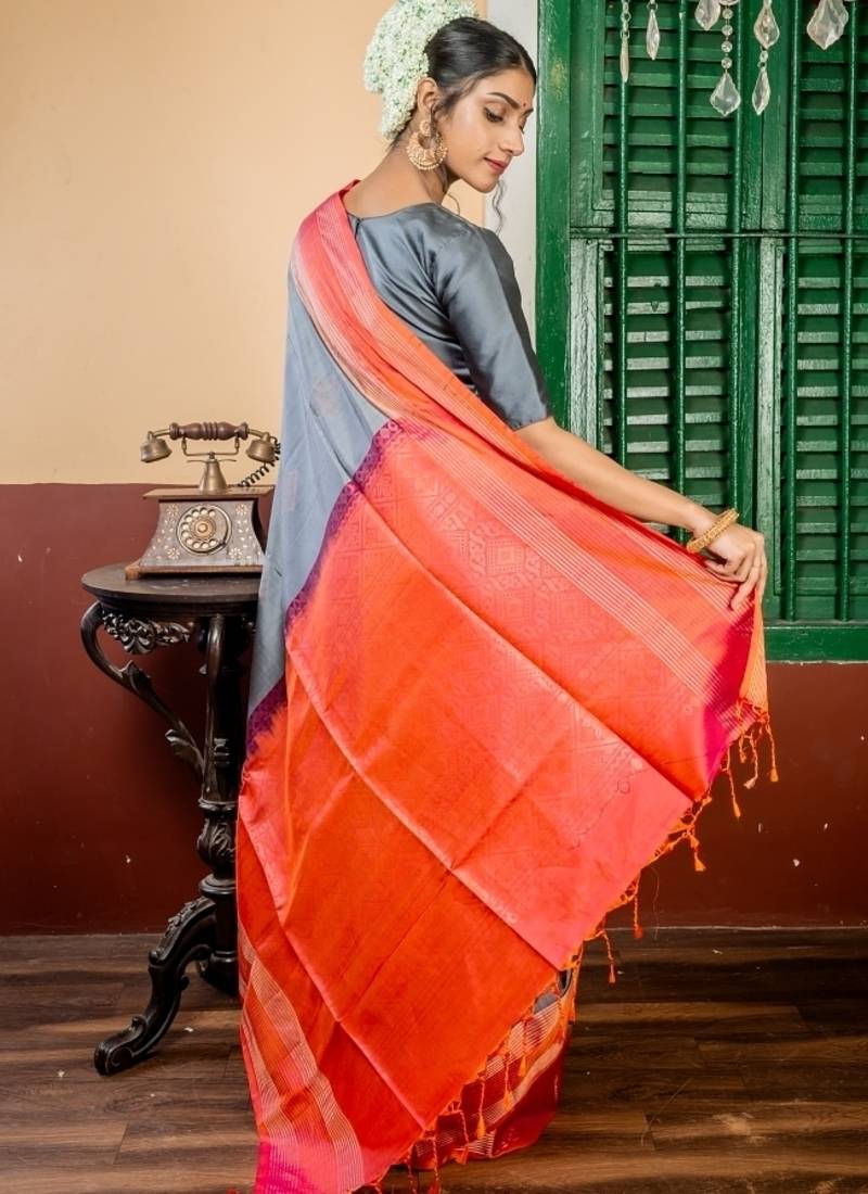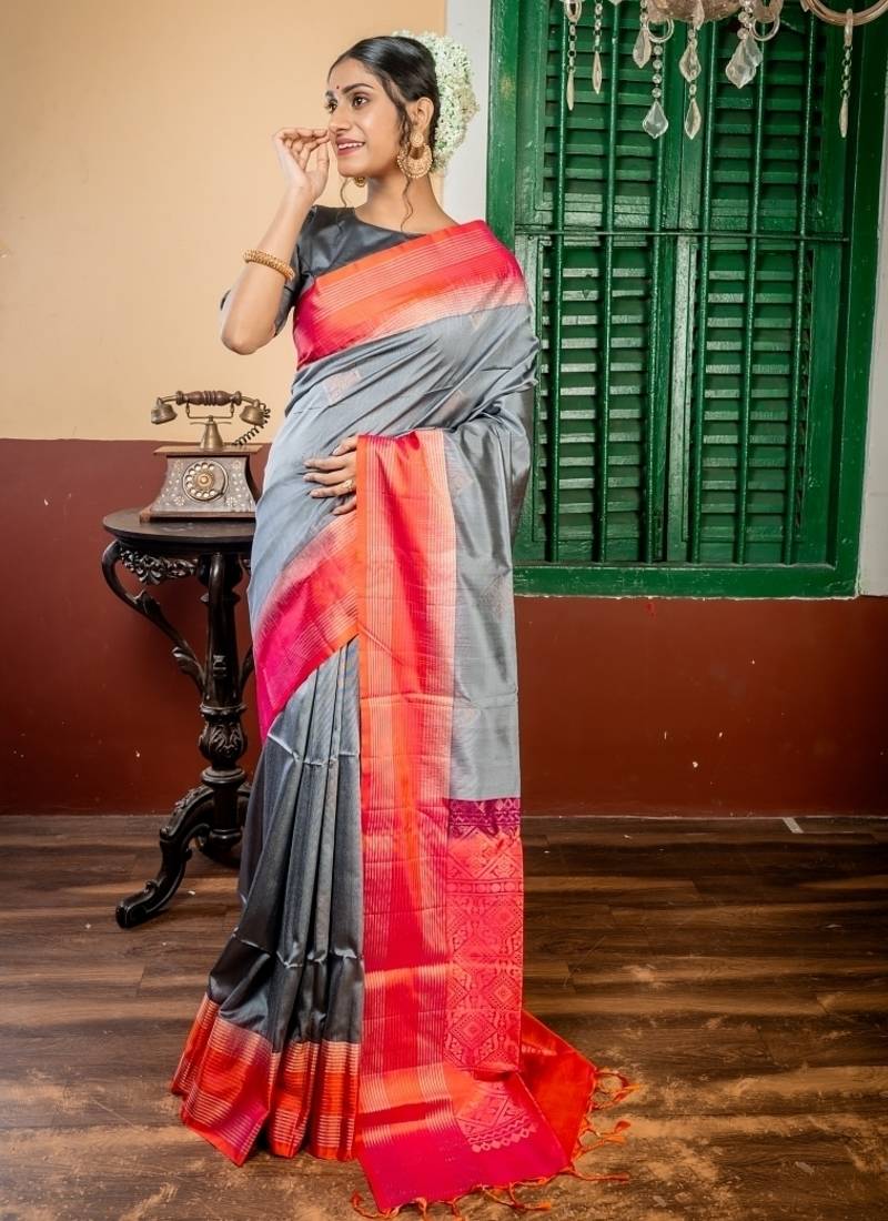 | Product Description | The Slate Grey Pattu Soft Silk Handloom Saree Is A Beautiful Fusion Of Understated Tones & Rich Handloom Detailing. The Pattu Soft Silk Body Is Embellished With All Over Antique Copper & Antique Silver Zari Traditional Buta, Offering A Rare Dual Metal Sheen. The Magenta Pink & Orange Dual Tone Border & Pallu Adorned In Antique Copper & Antique Silver Zari Is Woven In Classic Motifs.